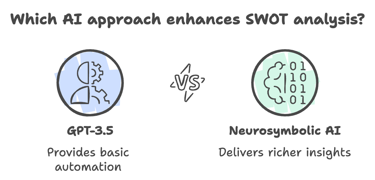 Then I discovered neurosymbolic AI—a hybrid of neural networks and symbolic reasoning. It sounded like something out of a sci-fi novel, and I had no idea what to expect. But the more I read, the more intrigued I became. What if this new form of AI could reveal the hidden depths of SWOT analysis, bringing out nuances and patterns that GPT-3.5 missed? There was only one way to find out.