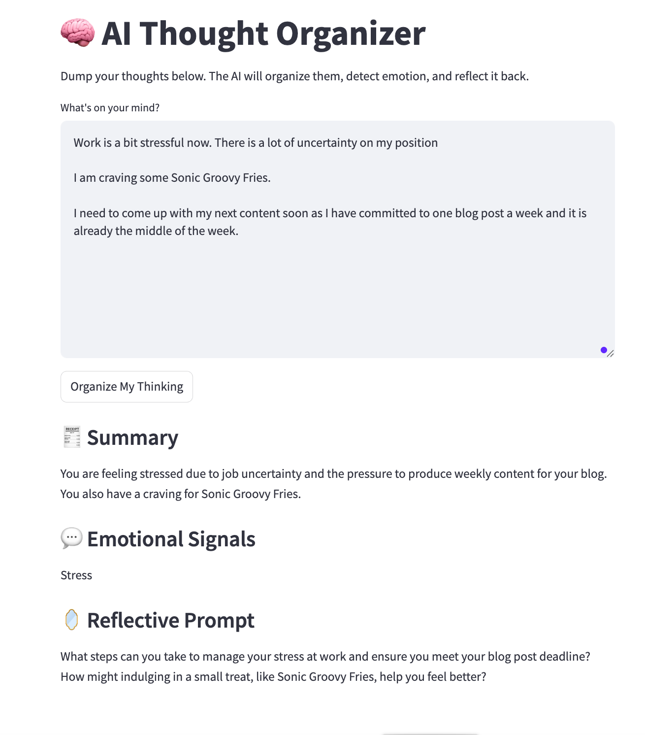 st.warning("Please enter your thoughts first.")This UI allows the user to dump thoughts, click a button, and see real-time reflection feedback from GPT-4.